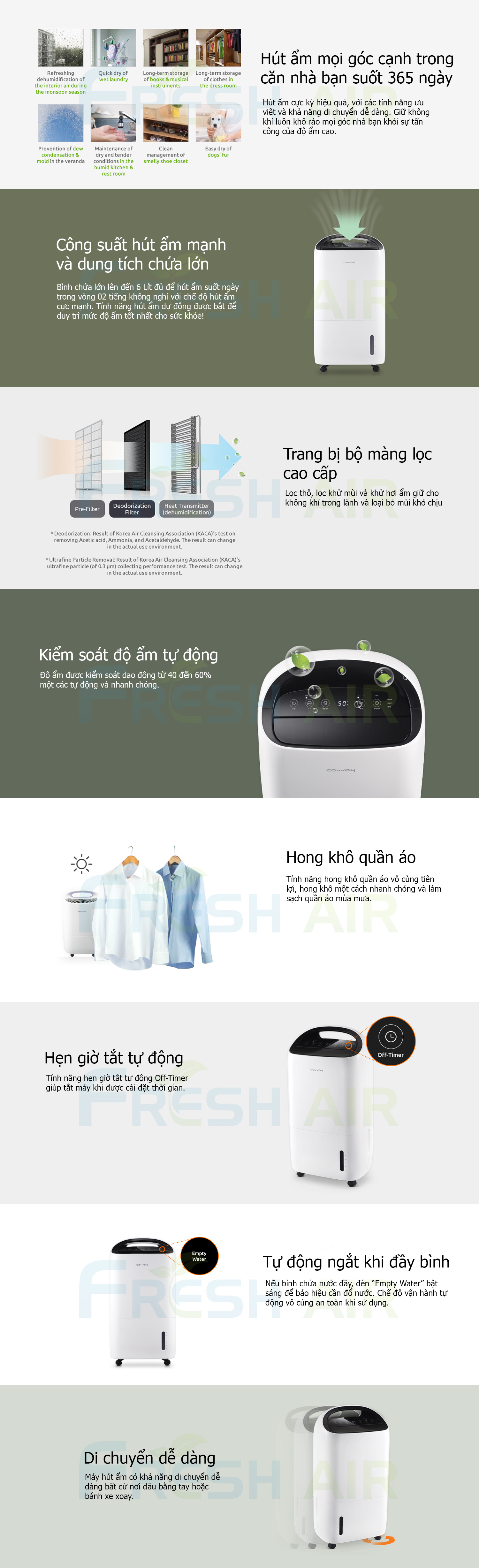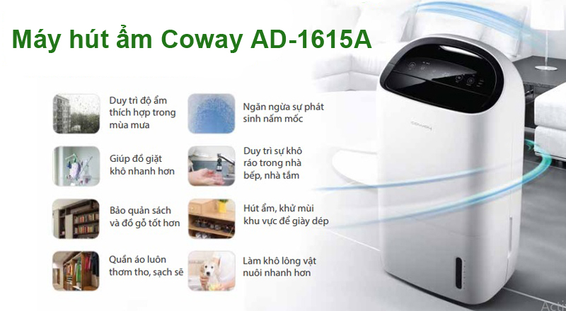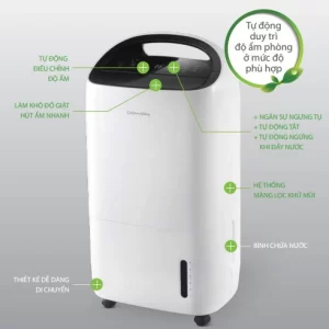 – Thương hiệu Coway, thương hiệu số 1 Hàn Quốc về các sản phẩm máy lọc không khí, máy hút ẩm trong 25 năm qua.- Sản xuất và nhập khẩu nguyên chiếc từ Hàn Quốc.- Có thể cài đặt độ ẩm mong muốn: Với cảm biến độ ẩm cực nhạy trên máy, bạn có thể cài đặt mức độ ẩm mà bạn mong muốn, máy sẽ hoạt động đến mức độ ẩm đó và dừng lại.- Chế độ hút ẩm liên tục thông qua ống thoát nước thải, bạn không cần lo lắng đỏ nước.- Trang bị màng lọc thô và màng lọc khử mùi than hoạt tính giúp làm sạch không khí trong phòng, khử sạch mùi hôi.- Dung tích bình chứa lớn tới 6L.- Thiết kế thời trang, phù hợp không gian nội thất.- Dễ dàng di chuyển với bán xe 360 độ.