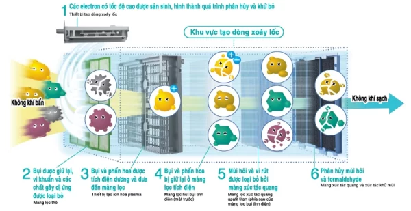 Máy lọc không khí Daikin MC70MVM6 là dòng sản phẩm máy lọc không khí mới nhất của Daikin với công nghệ tạo dòng xoáy Streamer phát ra dòng Plasma với các Electeron tốc độ cao hình thành quá trình phân hủy oxy hóa, giúp loại trừ vi khuẩn, nấm mốc, các độc chất nguy hại hay chất gây dị ứng trong không khí. Các thành phần gây ra mùi hôi sẽ bị hấp thụ qua phin lọc và sau đó bị phân hủy bởi công nghệ Streamer.